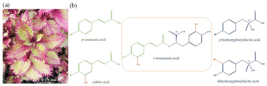 (a) Painted nettle (Plectranthus scutellarioides (L.) R.Br.) leaves morphology; (b) Chemical structures of p-coumaric acid, caffeic acid, p-hydrophenyllactic acid, dihydrophenyllactic acid, and trans-rosmarinic acid (picture taken by C.H.).
