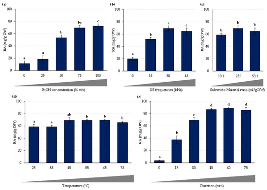 RA contents extracted from P. scutellarioides leaves as of function of (a) ethanol concentration, (b) ultrasound frequency, (c) solvent to material ratio, (d) extraction temperature, and (e) extraction duration. For a complete description of the extraction conditions, see text. Values are means ± SD of 3 independent replicates. Different letters (a–d) represent significant differences between the various extraction conditions (p < 0.05).