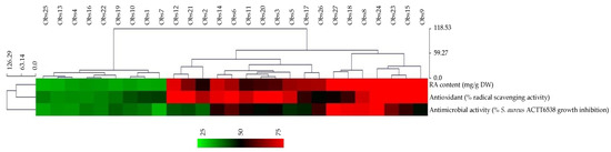 The next steps were the evaluation of the antioxidant and antimicrobial activities of the 27 extracts obtained using the full factorial design in order to confirm that the extraction did not alter the biological properties of RA and to establish correlations between these biological activities and the RA content. For this purpose, antioxidant activity was determined by the radical scavenging activity using the commonly used DPPH in vitro assay [44], whereas antimicrobial activity was determined by monitoring the growth inhibition of pathogenic strain of Staphylococcus aureus strain ACTT6538 using microplate method described by El Abdellaoui et al. [45]. The results are presented as a heatmap representation and classified using a hierarchical clustering analysis (HCA) using Euclidian distance (Figure 4). The individual values are presented in Table S1.