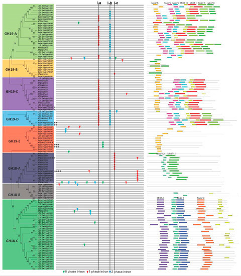 2.2. Phylogeny, Gene Organization, and Conserved Motif Analysis of the Chitinase Gene Family