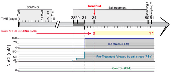 Design of the experimentation. Staggered sowing of the genotypes, with Tsushima-0 (Tsu0) sown at day 0, then Columbia-0 (Col0), Catania-1 (Ct1), and Thellungiella salsuginea (T.s.) sown 7, 9, and 10 days later, respectively, so as to synchronize bolting. Application of the salt treatment started three days before the floral bud appearance. The pretreatment phase (i.e., acclimation) of 150 mM of salt treatment preceded the beginning by three days. Sampling of the rosette and floral stem for the measurement of the fresh weight and dry weight was done at 16 days after bolting (DAB). Sampling of the main floral stem for anatomic studies and sugar quantifications was done at 17 DAB. Measurements of the stem height were done from 7 DAB to 16 DAB.
