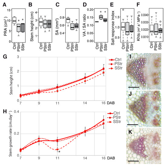 Responses of Thellungiella salsuginea to high salinity during the reproductive stage. Growth and anatomy of the stem of the control (Ctrl), salt stress (SStr), and pretreatment before stress (PStr) plants. In (A–F), the box and whisker plots show the distribution of the biological replicates. The black lines inside represent the medians; the top and bottom ends of the boxes represent the first and third quartiles, respectively; and the whisker extremities represent the maximum and minimum data points. (A) Projected rosette area at 17 DAB (n = 5–6). (B) Stem height at 17 DAB (n = 5–6). (C) Stem section area (SA) ratio at 17 DAB (n = 4–5). (D) Total vascular bundles area per section (VA)/stem section area (SA) ratio at 17 DAB (n = 4–5). (E) Salt response index at 16 DAB (n = 9–12). (F) Stem theoretical hydraulic specific conductivity (Khts) ratio at 17 DAB (n = 3–6). (G,H) Stem height and growth rate from 7 to 16 DAB. The curves represent for each time point the mean ± standard error (SE) (n = 9–12). (I,J,K) Details of the stem vascular bundles of the Ctrl plants (I), PStr plants (J), and SStr plants (K). Bar = 50 µm. Star (*) on the curves indicates a p < 0.05 with a t-test.