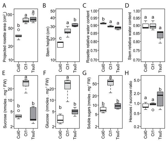 Natural variation in the size and sugar content of the Ctrl Arabidopsis plants. (A–H) The box and whisker plots represent the distribution of the biological replicates (see Figure 2 for details) with in (A) the projected rosette area (n = 5–6), (B) stem height (n > 9), (C) rosette relative water content (n = 4), (D) stem relative water content (n = 4), (E) sucrose content, (F) glucose content, (G) total soluble sugar content (i.e., sucrose, glucose, and fructose), and (H) and hexoses-to-sucrose ratio ((E–H): n = 5–6). All of the data were obtained at 17 DAB, except for the rosette and stem relative water content that were measured at 16 DAB. Different letters indicate significant differences among the accessions determined using a one-way analysis of variance (ANOVA), combined with a Tukey’s comparison post-test (p < 0.05).