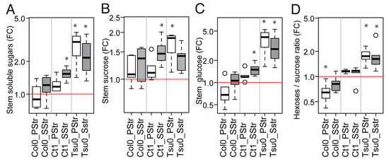 The natural variation of the response of the sugar content to salt treatment. Fold changes in the stem sugar contents in the PStr and SStr plants at 17 DAB. (A–D) The box and whisker plots represent the distribution of the biological replicates (see Figure 2 for details) with in (A) the fold changes in total soluble sugars, (B) the fold changes in sucrose, (C) the fold changes in glucose, and (D) the fold changes in hexoses-to-sucrose ratio (n = 5–6). FC—fold changes. Stars denote the significant differences of the treatments compared to the control plants (* p < 0.05, n ≥ 5). White bars—PStr plants. Grey bars—SStr plants.