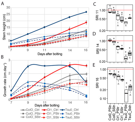 Stem growth in response to high salinity in Arabidopsis. Growth of the stem for the Ctrl, PStr, and SStr plants. The height of the stem was recorded at 7, 9, 11, 14, and 16 DAB. (A) The height of the stem and (B) the stem daily growth rate. The curves represent the mean ± SE (n = 9–18) for each time point. (C–E) The box and whisker plots represent the distribution of the biological replicates (see Figure 2 for details). (C–E) Salt response index (SRI) of the main stem at 11 (C), 14 (D), and 16 DAB (E). Stars denote significant differences of the treatments compared to the control plants (* p < 0.05, n ≥ 9). In white—PStr plants. In grey—SStr plant.