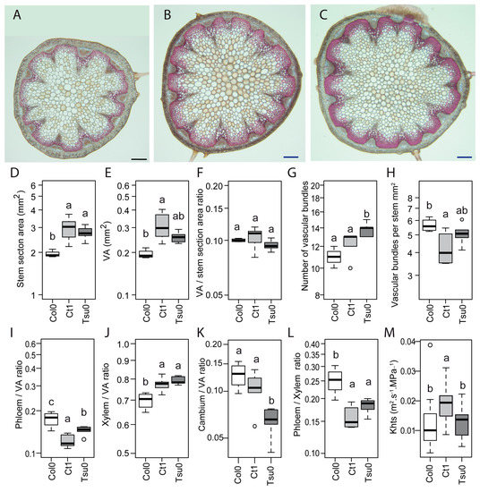 Natural variation of the anatomy in the stem of Arabidopsis plants at 17 DAB. (A–C) Representative stem sections of the Col0 (A), Ct1 (B) and Tsu0 (C) plants, with counterstaining with Safranin O and Alcian Blue. Bars = 200 µm. (D–M) The box and whisker plots represent the distribution of the biological replicates (see Figure 2 for details), for the stem section area (D), vascular area per stem section (VA) (E), vascular area/stem section area ratio (F), number of vascular bundles per section (G), number of vascular bundles per stem section area (H), phloem area/vascular area ratio (I), xylem area/vascular area ratio (J), cambium area/vascular area ratio (K), phloem area/xylem area ratio (L), and theoretical specific hydraulic conductivity (Khts) (M). Different letters indicate significant differences among accessions determined using a one-way analysis of variance (ANOVA) combined with Tukey’s comparison post-test (p < 0.05, n = 4–6, except for Khts, with n > 45).