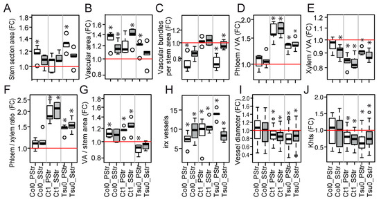 Natural variation in the Arabidopsis stem anatomy in response to a high salinity at 17 DAB. (A–I) The box and whisker plots represent the distribution of the biological replicates (see Figure 2 for details), within the (A) fold changes in the stem section areas, (B) the fold changes in the total vascular areas per stem section (VA), (C) the fold changes in the number of vascular poles per stem section surface unit, (D) the fold changes in the total phloem area/VA ratio per stem section, (E) the fold changes in the total xylem area/VA ratio per stem section, (G) the fold changes in the phloem area-to-xylem-area ratio, (G) the fold changes in the VA per surface unit of the stem section, (H) the number of irregular xylem (irx) vessels per vascular bundle, (I) the fold changes in the xylem vessel lumen area (J), and the fold changes in theoretical hydraulic specific conductivity. In grey—SStr plants. In white—PStr plants. FC—fold changes. Stars denote significant differences of salt treatment compared to the control condition (* p < 0.05, n = 4–6, except for the irx vessels and Khts values, with n > 36).