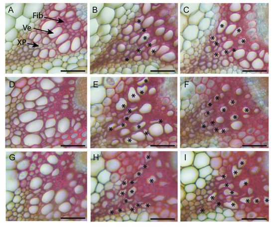 Observation of irregular xylem vessels under high salinity in the stem of Arabidopsis. Details of the xylem cells in the vascular bundles of Ctrl, PStr, and SStr plants at 17 DAB, observed in the stem section after staining with Safranin O and Alcian Blue. (A,D,G) Ctrl Plants, (B,E,H) PStr plants, (C,F,I), and SStr plants for Col0 (A–C), Ct1 (D–F), and Tsu0 (G–I). Stars (*) indicate irx vessels. Ve—vessel. Fib—xylem fiber. XP—xylem parenchyma cell. Bars = 50 µm.