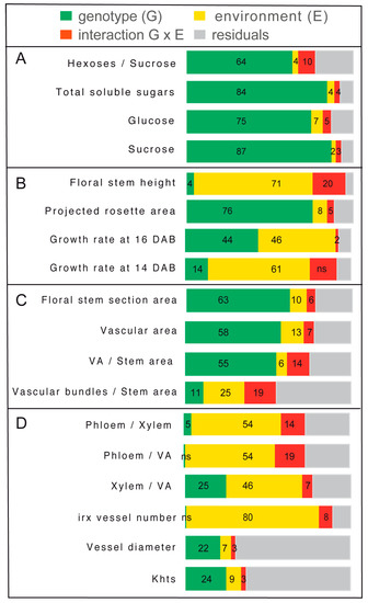 Analysis of variance of the traits measured during the reproductive stage, showing the effects associated with the genotype (G), the environment (E), and the interaction of genotype x environment (GxE) within the overall variations. VA—total vascular area per stem section. irx—number of irregular xylem cells per xylem section. Khts—theoretical hydraulic specific conductivity. For more details on the data, see the legends of Figure 3, Figure 4 and Figure 6. For each trait, the bars represent the sum of the squares associated with each factor, shown as proportions. The percentages of factors showing significant effects (p < 0.05) are indicated directly in the graph (ns for not significant effects). (A) Traits relative to the stem sugar content. (B) Growth traits of the rosette and stem. (C) Stem anatomic traits. (D) Traits relative to the stem vascular tissues.