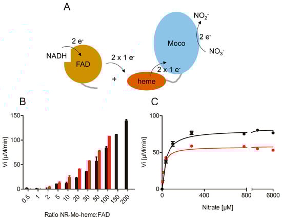 Different ratios of NR-Mo-heme and NR-FAD (1:1–200) were mixed to restore the original electron transfer path using NADH and nitrate as substrates (Figure 2A). As the NR-FAD fragment was found to exhibit substantial diaphorase (NADH:O2 oxidoreductase) activity, the assay was performed under anaerobic conditions. With increasing NR-FAD concentrations, increasing enzyme-specific nitrate reductase activities were observed for both isoforms up to the maximal FAD concentrations of 10 or 20 µM (Figure 2B). Subsequently, we recorded nitrate-dependent NADH steady-state activity using an enzyme re-constituted with a ratio of 1:50 for both isoforms and found that the re-constitution of full-length activity was successfully achieved and that it was nitrate concentration dependent (Figure 2C). These kinetic series yielded an apparent kcat = 9.6 s−1 for composite NIA1, and kcat = 13.4 s−1 for composite NIA2. Both of these activities were somewhat lower compared to those obtained with MV as an electron donor and also compared to the reported parameters of full-length NIA2 (kcat = 33 s−1) []. This can be explained by the lack of covalent contact between the heme- and the FAD-domain, which required the use of an excess of FAD fragment to increase the interaction between the separated protein fragments. Consequently, the respective apparent KM values were found to be lower due to the reduction in kcat, which is a result of the decreased electron transfer rate (apparent KMnitrate = 17 µM for NIA1, 35 µM for NIA2).