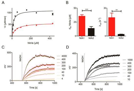Therefore, the aim of our study was to analyze the functional properties of the recombinantly expressed NIA1 from Arabidopsis thaliana in comparison to the properties of NIA2 to reveal whether the distinct functions in the plant are due to distinct isoform-specific kinetic properties or due to specific expression and activation state of either isoform in different plant tissues. Using our well-defined in vitro activity assays, we were able to measure the substrate-dependent velocities without any inhibiting effects/modulators that might be present when using (partially) purified enzyme from plant tissue.
