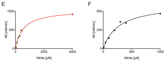 For the evaluation, the areas under the steeply increasing start of the curve were determined (typically for 200 s) and converted to pmol NO by comparison with an NO standard curve that had been prepared as described elsewhere []. It was assumed that the amount of detected NO in the gas phase correlated with the concentration of NO in the solution. Therefore, by converting the amount of NO released from the 3 mL (at a given concentration of substrate nitrite) to NO concentration, resulted in an estimate of NO synthesis velocity (vi). By plotting this against the substrate concentration, a Michaelis–Menten-like plot was generated. For the determination of inhibition of nitrite reduction by nitrate, the NO synthesis velocity with 400 µM nitrite was set to 100% activity, and the reduced activities in the reaction samples were compared with this.
