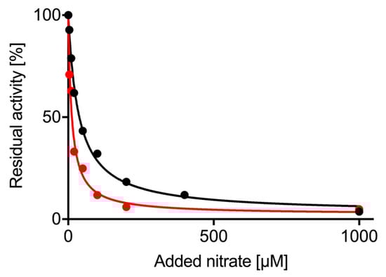 Inhibition of nitrite reductase activity by nitrate. Using re-constituted NR-activity, NO production by NIA1 (red) or NIA2 (black) was monitored on the NO analyzer with 400 µM nitrite. Increasing concentrations of nitrate were added simultaneously with the nitrite, and NO production decreased. The % residual activity was fitted with a hyperbolic curve (GraphPad Prism 7) and IC50 and Imax for nitrate determined.