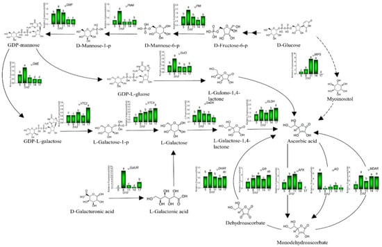 Gene expression profiles in ascorbic acid synthetic and metabolic pathways during legume development. Different letters are statistically different (p ≤ 0.05) and represent the differences between treatments. PMI: mannose-6-phosphate isomerase; PMM: phosphomannomutase; GMP: mannose-1-phosphate guanylyltransferase; GME: GDP-mannose 3,5-epimerase; VTC2: GDP-l-galactose phosphorylase; VTC4: l-galactose-1-phosphate phosphatase; GalDH: l-galactose dehydrogenase; GLDH: l-galactonolactone dehydrogenase; GalUR: d-galacturonate reductase; MIPS: myo-inositol-3-phosphate synthase; GulO: l-gulonolactone oxidase; AO: l-ascorbate oxidase; APX: l-ascorbate peroxidase; GR: glutathione reductase; DHAR: dehydroascorbic acid reductase; MDAR: monodehydroascorbate reductase.