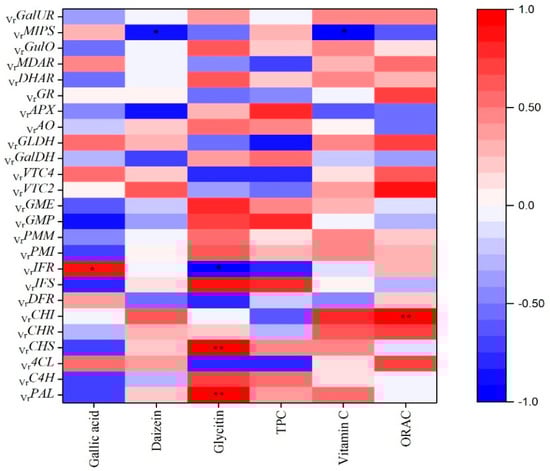As shown in Figure 2, the greatest VrPMI, VrPMM, VrGMP, VrGME, VrGalDH, VrGalUR and VrGulO expressions were presented in mung beans during legume development on 8 DAF, while the highest VrVTC2, VrVTC4 and VrGLDH expressions were observed on 17 DAF. As for the genes in the ascorbate-glutathione cycle, the highest expressions of VrDHAR and VrMDAR were shown on 8 and 17 DAF, while the VrGR and VrAPX demonstrated the greatest expressions on 11 DAF and VrAO indicated the supreme expression on 5 DAF. In addition, Figure 3 reveals the Pearson’s correlation coefficient among the ascorbic acid content and genes on ascorbic acid biosynthesis. VrPMI, VrPMM, VrGME, VrVTC2, VrVTC4, VrGLDH, VrGalUR, VrGulO, VrAO, VrDHAR and VrMDAR were positively correlated with ascorbic acid content in mung beans during legume development; on the contrary, VrGMP, VrGalDH, VrMIPS, VrGR and VrAPX were negatively correlated with ascorbic acid content. In particular, VrMIPS exhibited significantly negative correlations with ascorbic acid content (R2 = −0.95, p < 0.05). Interestingly, VrCHI from the phenylpropanoid biosynthetic pathway had a strong positive correlation with ascorbic acid content (R2 = 0.75). Yabuta demonstrated that VTC2 had a critical role in modulating ascorbic acid concentrations in kiwifruit species under abiotic stresses []. In addition, Zhang found that VTC2 was a key rate-limiting step in rice ascorbic acid biosynthesis []. The higher contents of ascorbic acid were shown on 8 and 17 DAF with no significant differences (p < 0.05). It showed that VrVTC2 and VrGME have the highest expressions on the 17 and 8 DAF, respectively. Bulley and Laing put forward that ascorbic acid content appears to mainly be the result of variation in transcription of VTC2 and GME in synergy []. We considered that high ascorbic acid content on 8 and 17 DAF in mung beans during legume development might be due to the greatest expressions of VrVTC2 and VrGME on 8 and 17 DAF. Other genes up-regulated on 8 and 17 DAF, including VrPMI, VrPMM, VrGME, VrVTC2, VrVTC4, VrGalDH, and VrGLDH from the L-galactose pathway; VrGalUR from the D-galacturonic acid pathway; VrGulO from the L-gulose pathway, may also contribute to the rise in ascorbic acid content on 8 and 17 DAF in mung beans during legume development, but they might not be the main cause. The low expression of genes in ascorbic acid biosynthesis results in the low level of ascorbic acid content on 5, 11 and 14 DAF. What is more, the highest expression of VrAPX was found on 11 DAF, we consider VrAPX seems to make more ascorbic acid convert to monodehydroascorbate in the ascorbic acid recycling pathway (ascorbate-glutathione cycle), thus ascorbic acid content came to a sudden reduction on 11 DAF. The highest expressions of VrDHAR and VrMDAR on 8 and 17 DAF via the ascorbate-glutathione cycle may positively correlate with the enhancement of ascorbic acid content on 8 and 17 DAF in mung beans during legume development.