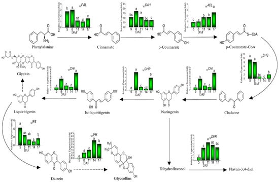 Gene expression profiles in phenolics synthetic pathway during legume development. Different letters are statistically different (p ≤ 0.05) and represent the differences between treatments. PAL: Phenylalanine ammonia lyase; C4H: cinnamic acid 4-hydroxylase; 4CL: 4-coumarate-CoA ligase; CHS: chalcone synthase; CHR: NAD(P)H-dependent 6′-deoxychalcone synthase; CHI: chalcone flavanone isomerase; IFS: isoflavone synthase; IFR: isoflavone reductase-like protein; DFR: vestitone reductase.