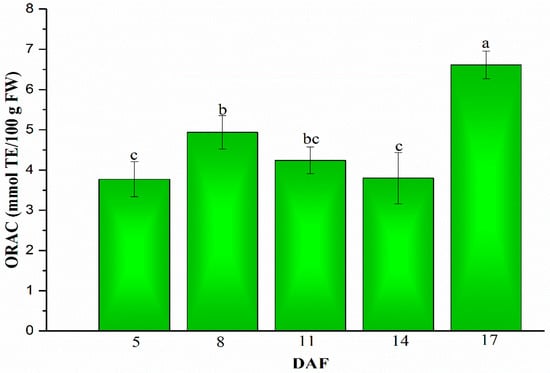 Antioxidant activity evaluation in extraction of five stages (5, 8, 11, 14 and 17 DAF) in mung beans during legume development performed by ORAC assay. As shown in Figure 5, the ORAC assay results are more accurate because human errors and frustration associated with the tedious sample preparation could be eliminated []. Firstly, the ORAC value increased from 5 to 8 DAF in the change from 3.77 ± 0.44 to 4.93 ± 0.42 mmol TE/100 g FW, and then the ORAC value decreased to 3.80 ± 0.64 mmol TE/100 g FW on 14 DAF. Finally, the ORAC value came to a big growth to 6.62 ± 0.35 mmol TE/100 g FW on 17 DAF, which was an almost 2-fold increase in the ORAC value of 5 DAF.