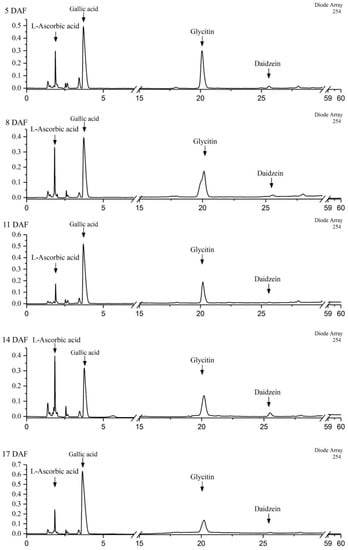 Phenolics and ascorbic acid analysis of mung bean extracts were executed by HPLC referring to the former study [] and slightly modified. Briefly, phenolics and ascorbic acid were separated using C18 column (250 × 4.6 mm, 5 μm) with a temperature of 35 °C and detected by Waters 2998 Photodiode Array Detector (Waters Co., USA) at 254 and 280 nm wavelengths, respectively. The column was eluted with a gradient of 0.1% trifluoroacetic acid in water (A) and acetonitrile (B) at the flow rate of 1.0 mL/min. The gradient elution was as follows: 0–5 min (95% A), 5–40 min (95–75% A), 40–47 min (75–62% A), 47–49 min (62–55% A), 49–51 min (55% A), 51–70 min (55–20% A), 70–75 min (20–5% A), 75–77 min (5–95% A), 77–90 min (95% A). The injection volume was 30 μL. l-ascorbic acid, gallic acid, daidzein and glycitin (St. Louis, Mo, USA) were used as standards. Measured values were expressed as milligrams per 100 g of the fresh weight of mung bean (mg/100 g FW), averages were expressed from three biological replicates. HPLC profiles for ascorbic acid and phytochemicals at 254 nm in mung beans during legume development are listed in Figure 6.
