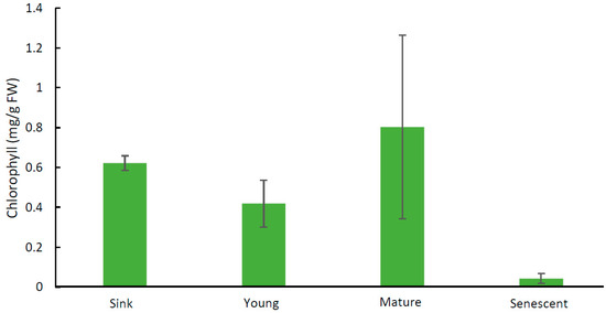Chlorophyll content of leaves of Pisum sativum. Expanding sink leaves (sink), source leaves subtending pods five days after flowering (young) and 20 days after flowering (mature), and senescing leaves were analysed. Data are the averages of two biological replicates, with three replicate extractions for each sample. Results are ± s.d.
