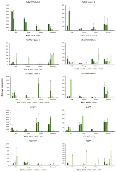 Relative expression of Sugar Will Eventually be Exported Transporter (SWEET), sucrose transporter (SUT), amino acid permease (AAP) transporter gene families, cell wall invertase (CWINV), cytokinin biosynthesis (IPT), and cytokinin degradation (CKX) gene families in leaves of Pisum sativum of different ages (sink: expanding sink leaves; young: source leaves subtending pods five days after flowering; mature: source leaves subtending pods 20 days after flowering; senescent: senescing leaves). Mean fold-change values (y-axis) were calculated using PsEF, PsGAP, and PsACT as internal controls. The results are expressed as the average of two biological replicates, with three technical replicates for each. Results are ± s.d.