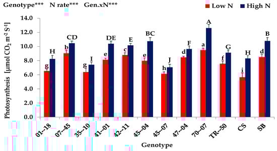 In general, an optimal external N supply has a substantial effect on the leaf area [] and leaf area duration that play an important role for the light interception and carbon assimilation by crops []. Consequently, biomass production and yield of a crop is strongly dependent on its leaf area as well as the rate of leaf photosynthesis []. On the other hand, a suboptimal supply of N usually limits the leaf growth rate and thus the leaf area index (LAI) due to low rates of net photosynthesis, insufficient cell expansion, or both of these factors []. In agreement with all these studies, our results clearly indicated that an increase in N supply has an encouraging contribution to shoot dry biomass, shoot N uptake, shoot N concentration, total leaf area, photosynthesis and NRA activity.