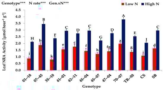 The variations among genotypes and the growth response to supplied N, i.e., the interaction between N supply and genotypes were also highly significant (p < 0.001) in shoot dry matter, shoot N uptake, shoot N concentration, total leaf area, photosynthesis and leaf nitrate reductase (NRA) activity (Table 1, Figure 1 and Figure 2) The variation among genotypes was usually significant, but smaller at low than high N condition. The exhibited variation ranged between 8.9 and 35.1 g/plant in shoot dry matter, 126.7 and 1003.6 mg/plant in shoot N uptake, 6.8 and 9.4 mg/g in shoot N concentration, 0.11 and 1.14 m2/plant in total leaf area, 3.84 and 5.56 µmol/m2/s in photosynthesis and 1.20 and 1.73 µmol/hour/g in NRA activity at low and high N rates, respectively. The highest shoot dry matter was shown by gourd genotypes 70-07 and 07-45 while the lowest was shown by 35-10 and 45-07 at low N supply. These results clearly indicate that both gourd genotypes 70-07 and 07-4 can be characterized as ‘N-efficient’ due to realizing an above-average yield (shoot dry biomass) under suboptimal (low) N supply []. Based on this reference, the lowest shoot dry biomass yielding gourd genotypes 35-10 and 45-07 can be characterized as ‘N-inefficient’.