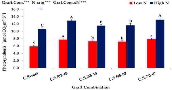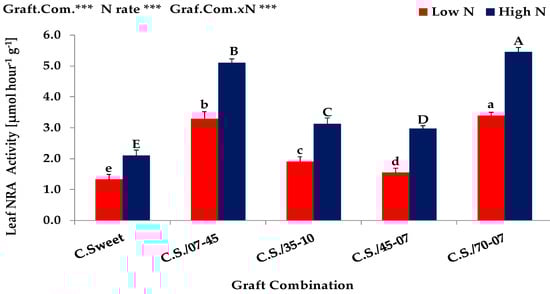 Similar to nitrogen impact, grafting also had significantly positive effects and therefore the grafted plants showed significantly higher performance in shoot growth, N uptake, leaf area development, photosynthesis and leaf NRA activity than non-grafted control plants grown at both low and high N rates (Table 3, Figure 3 and Figure 4). As compared to non-grafted control plants, the grafting increased (maximum) the shoot dry matter by almost 146% and 293%, the shoot N uptake by 146% and 282%, the total leaf area by 78% and 336%, leaf photosynthesis by 33% and 23% and the NRA activity by 156% and 160% at low and high N rate, respectively. These results highly corroborate several grafting experiments [,], conducted to increase the growth and the tolerance of various scions (melon and water melon) to low N stress conditions.