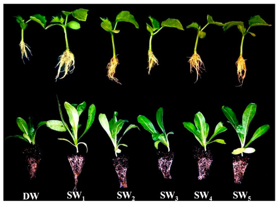 Effect of DW and smoke-water (SW1–5) on seedling growth of cucumber (up) and scotch marigold (down).