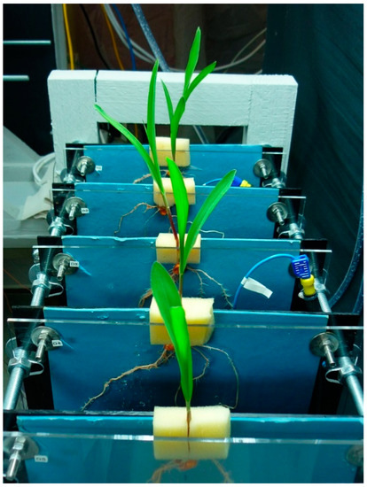 Picture of experimental setup. Maize seedlings grown on individual mounting plates of acrylic glass fixing the plants’ rout system on germination paper. Mounting plates are reversibly fixed in four hangers arranged in front of the infrared (IR) camera.