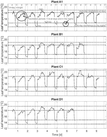 Leaf temperature time series of plants A1, B1, C1, and D1. ││ abrupt temperature changes at illumination switch-on/-off (day–night cycle). - - - oscillations of 1–2 °C amplitudes and 3–4 days periods in the days. ….. oscillations with amplitudes of approximately 1 °C and periods up to 5 days at nights. O oscillations of <1 °C amplitudes and <1d periods in the days and partially also at nights.