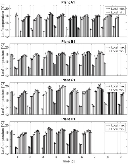 In Figure 3 the results of the MM are presented. Here, the measured local maxima (attributed to stomatal opening and resulting in leaf temperature decrease) and local minima (attributed to stomatal closure and resulting in leaf temperature increase) for the plants A1, B1, C1, and D1 are depicted. These local extrema represent the inflection points at which the leaf temperatures switch from decreasing values to increasing values (or vice versa). This means only the respectively smallest measured value before a temperature rise and the respectively highest measured value before a temperature decrease are depicted in the diagram.
