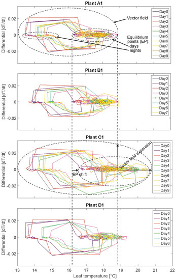 Two equilibria, or areas of attraction, are depicted, denoting temperature ranges during daytime (accumulation/queue of small circles, e.g., for plant A1 at temperatures between 16 °C and 19 °C) and at night (accumulation/queue of very small circles, e.g., for plant A1 at temperatures between 13.5 °C and 15.5 °C). These two equilibria for the values during daytime and the values at night are illustrated by the two smaller, broken-lined ovals in the PP of plant A1 and exemplary also for plant C1. Plant C1 (high stress) shows a shift of the equilibrium point in the days towards higher leaf temperatures. The vector field is illustrated exemplary by the large, broken-lined oval in the PP of plant A1 and C1 representing the totality of all measured leaf temperature values for the particular plant. Here, the vector field of plant C1 is extended compared to the one of plant A1. The value of the leaf temperature change rate denotes the speed of temperature changes between two measurements. It was expected to observe a vector field extension (additionally, higher leaf temperatures and change rates) for stressed plants compared to fully irrigated plants (cf. assumption A-I).