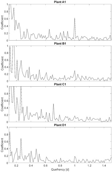 Cepstrum of plants A1, B1, C1, and D1. Quefrency represents a periodic time interval, and the coefficient is dimensionless and represents the echo of a specific frequency.
