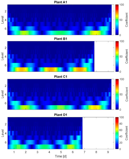 Wavelet transform of plants A1, B1, C1, and D1. For the seven model-based frequency levels the coefficient represents the amplitudes of oscillations.