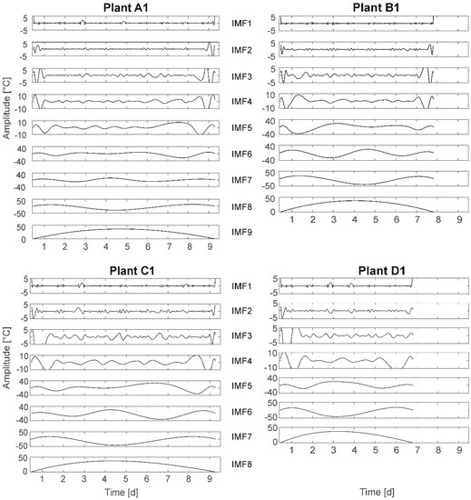 Hilbert–Huang Transform of plants A1, B1, C1, and D1. Frequency spectrum is depicted in a set of curves (IMFs) with the time on the x-axis and the amplitude on the y-axis. In HHT amplitudes of up to 50 °C are depicted. These high temperature values are not real values in terms of surrounding air temperature, but are a result of the specific algorithm used in HHT. Here, amplitudes larger than the natural temperature variations represent superimposed vibrations of the signal of lower frequencies hidden in the temperature signal, and therefore are depicted in °C.