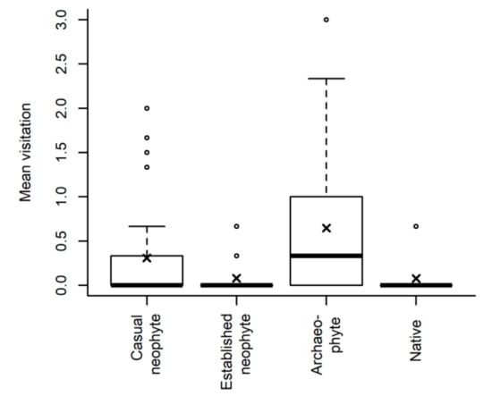 Nine species never flowered during the experiment (Centaurea diffusa, Erigeron annuus, Erigeron canadensis, Erigeron sumatrensis, Iva xanthiifolia, Lactuca serriola, Lactuca virosa, Lapsana communis, Rudbeckia hirta) while two species (Senecio vulgaris and Sonchus asper) had already finished their flowering time before flower visitors were observed. For the remaining 31 species, we found no effect of MRT on flower visitors (likelihood ratio test, χ2 (1 df) = 0.22, p = 0.637). However, there is a significant effect of status (likelihood ratio test, χ2 (3 df) = 10.67, p = 0.014) with archaeophytes receiving the most flower visitors (Figure 1). Of note, flower visitors (potential pollinators) that visited plants were mainly honeybees (Apis spp.), bumblebees (Bombus spp.) and flies (Diptera); whereby archaeophytes received the most fly visits and individuals of this status group were also on average more often visited by bees (Supplementary Materials Table S2).