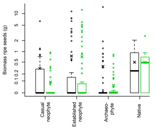 Our results attested that plants’ number of capitula, reproductive biomass as well as day of flowering were not different indiscriminately by the presence or the absence of flower visitors; however, difference between treatments were seen in plants with regard to the day of producing seeds as well as the number and biomass of ripe seeds, which represent the closest fitness proxy for annual plants. Natives produced seeds the earliest, followed by archaeophytes and established neophytes. Notably, there are only few studies that tested the role of seed phenology on invasion biology, while most of them focus on flower phenology and its duration []. However, our outcome is in line with a previous study by Lediuk et al. [], where it demonstrated a delay in producing seeds for alien species, with natives being faster. The experienced gap between natives and aliens in seed phenology is explained as an adaptation of the latter species: When flowering or, in our case, seed phenology of the species does not overlap, the lack of resource competition may enhance seed dispersal by mutualists of alien species, thus favoring their spread [,,]. In this way, delaying seed production, alien plants could potentially be faced with an empty niche and thus have the possibility to create new adaptation to new mutualisms. Nevertheless, the very late seed ripening for casual neophytes may be an important factor preventing their invasion success.