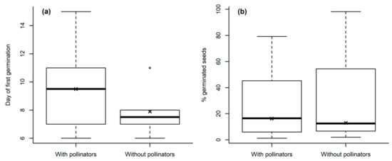 Surprisingly, seeds from the treatment “without pollinators” germinated marginally significantly earlier than plants where flower visitors had free access (likelihood ratio test, χ2 (1 df) = 3.53, p = 0.060, Figure 3a). However, there were no differences in the percentage of germinated seeds between treatments (likelihood ratio test, χ2 (1 df) = 1.60, p = 0.207) (Figure 3b).