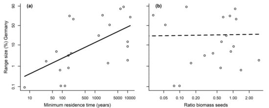 (a) Range size depending on minimum residence time; and (b) pollinator dependence (i.e., measured as mean biomass seeds without pollinators/mean biomass seeds with pollinators) for the 21 Asteraceae species for which the ratio could be calculated (i.e., biomass seeds with pollinators not zero). All axes are shown on a log-scale. Significant effects (with the other covariate fixed at its mean) shown with a solid line, non-significant effects with a dashed line.