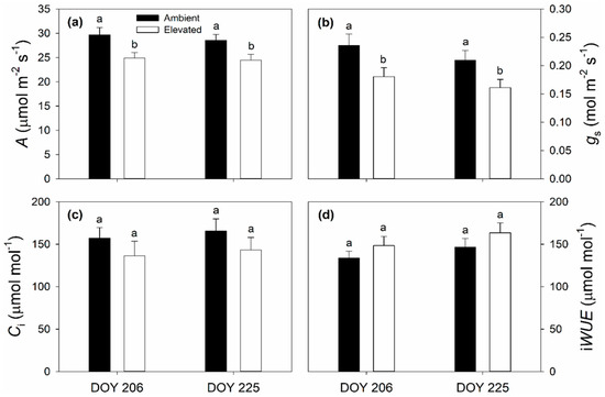 Average values of: net CO2 assimilation rate (A) (a); stomatal conductance (gs) (b); intercellular CO2 concentration (Ci) (c); and instantaneous water use efficiency (iWUE) (d) of ambient and elevated O3 concentration treated switchgrass leaf measured on 25 July (DOY 206) and 13 August (DOY 225) in 2018. Error bars show standard errors (n = 3). Significant differences between ambient and elevated O3 are indicated by different letters.