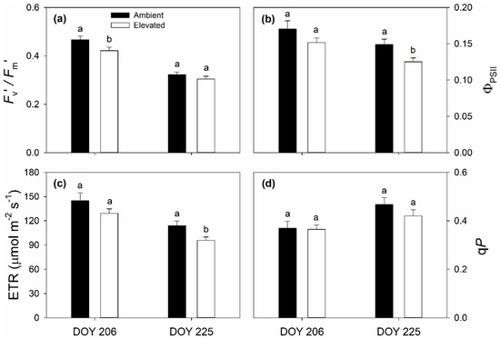 PSII maximum efficiency (Fv’/Fm’) (a); quantum yield of PSII (ΦPSII) (b); electron transport rate (ETR) (c); and coefficient of photochemical quenching (qP) (d) in ambient and elevated O3 concentration treated switchgrass leaf measured on DOY 206 and DOY 225 in 2018. Error bars show standard errors (n = 3). Significant differences between ambient and elevated O3 are indicated by different letters.