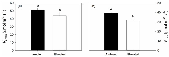 Maximum carboxylation capacity of PEPC (Vpmax) (a); and CO2-saturated photosynthetic rate (Vmax) (b) of switchgrass grown at ambient and elevated O3 concentrations measured on DOY 206 in 2018. Error bars show standard errors (n = 3). Significant differences between ambient and elevated O3 are indicated by different letters.