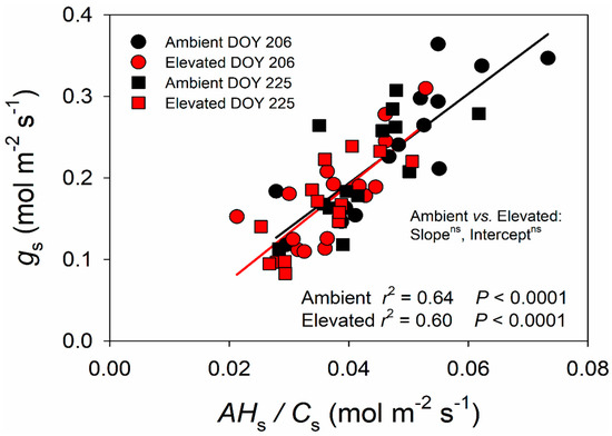Relationship between stomatal conductance (gs) and for switchgrass grown under ambient and elevated O3 concentrations measured on DOY 206 and DOY 225 in 2018, where A is net CO2 assimilation rate (µmol (CO2) m−2 s−1), Hs is relative humidity (Pa (air) Pa (Saturated)−1) and Cs is CO2 concentration (Pa (CO2) Pa (air)−1) at the leaf surface. The data were fitted by linear regressions.