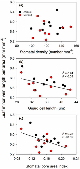 Relationship between leaf vein length per area and stomatal density (a); relationship between leaf vein length per area and guard cell length (b); and relationship between leaf vein length per area and stomatal pore area index (c). The data in (b,c) were fitted by linear regressions.