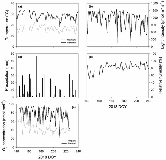 Daily maximum and minimum air temperature (a); averaged light intensity (b); precipitation (c); averaged daily relative humidity (d); and O3 concentration (e) during growing season in 2018 measured by an on-site weather station at the FACE facility in Champaign, IL.