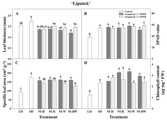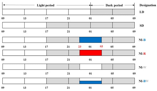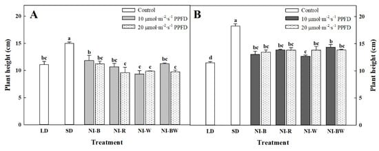 The critical day length required to induce flowering of the SDP used throughout this study was 12 h, and hence, an uninterrupted dark period longer than 12 h was sufficient to initiate flowering. However, SD with 16 h of darkness were used in this study to confirm a clear flowering response. Here, 10 μmol·m−2·s−1 or 20 μmol·m−2·s−1 PPFD LEDs were used to provide NI with either blue (450 nm, NI-B), red (660 nm, NI-R), white (~400–800 nm, NI-W), or blue and white (450 nm, ~400–800 nm, NI-BW) lights from 23:00 to 03:00 every day.