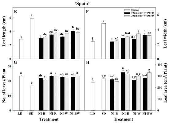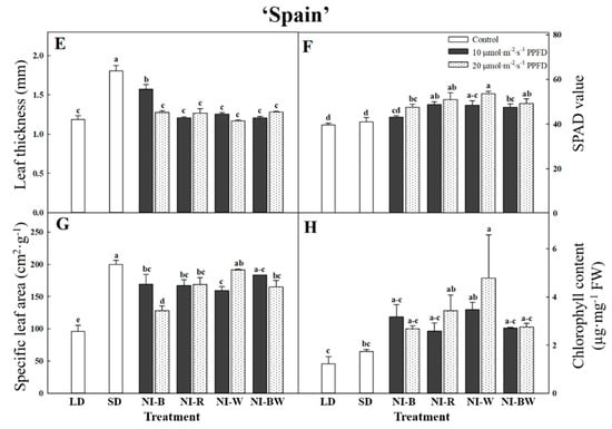 In this study, the plant height, leaf length, and leaf width were the greatest for plants in SD (Figure 2A, Figure 3A,B). Additionally, the higher the light intensity of NI, the shorter the plant height, except in the NI-W treatment of ‘Spain’ (Figure 2A). While the leaf area and the number of leaves per plant showed different results (Figure 3C,D), the specific leaf area, SPAD value, and chlorophyll content showed a similar tendency to that of plant height (Figure 4B–D). The shoot fresh weight, root fresh weight, and root dry weight were not significantly influenced by the quality and intensity of the NIL (Table 1).