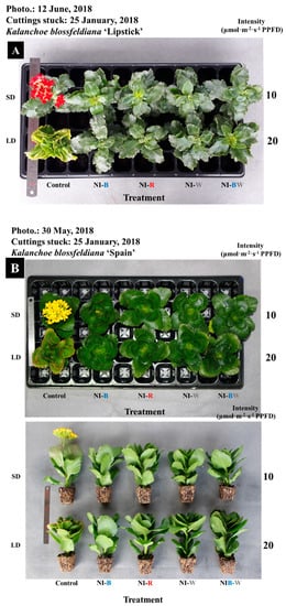 In conclusion, for both cultivars, plants in the SD were significantly shorter than those in other treatments. The flowering of ‘Lipstick’ was not affected by the NIL quality, while ‘Spain’ flowered when grown in the SD and 10 μmol·m−2·s−1 PPFD NI-B. These results suggest that the quality and intensity of the NIL affect the morphogenesis and flowering of kalanchoe, and that the responses were cultivar-dependent. Further research is needed to determine how morphogenesis and flowering are affected by the NIL quality and intensity in other kalanchoe cultivars. For the control of flowering in crops, more practical considerations should be given to the NI strategy.