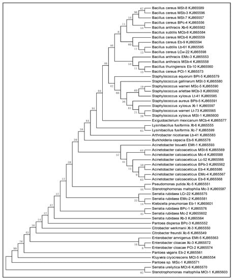 To study the phylogenetic relationships among bacterial strains, the sequences were first aligned with the multiple sequence alignment program (ClustalW) using MEGA 6 software. The phylogenetic tree was constructed using the neighbor-joining method to show evolutionary relationships among different isolates (Figure 1). In the phylogenetic tree, the first cluster was comprised of different strains of Bacillus. The second cluster includes Staphylococcus equorum BPt-5, Staph. gallinarum MSt-3, Staph. warneri MSc-5, Staph. arlettae MCb-3, Staph. xylosus Lt-41, Staph. aureus BPb-5, Staph. xylosus Xt-1, Staph. warneri Lt-73 and Staph. xylosus MSt-1. Similarly, different strains of Acinetobcter (Ac. bouvetii EMt-1, Ac. calcoaceticus MSt-6, Ac. calcoaceticus Mc-4, Ac. calcoaceticus Lc-52, Ac. colcoaceticus BPb-3, Ac. colcoaceticus Eb-4, Ac. colcoaceticus EMc-4, Ac. colcoaceticus Eb-8) covered another large cluster in the tree. Additionally, different strains of Gram-negative genera occupied the lower portion of the phylogenetic tree.