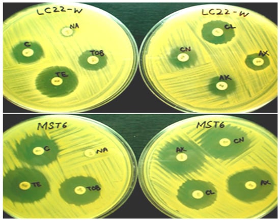 Antibiotic susceptibility pattern of purified strains of B. cereus LCw-22 and A. calcoaceticus MSt-6. Plates were incubated at 37 °C for 24 h. Abbreviations: C = chloramphenicol, NA = nalidixic acid, TE = tetracycline, TOB = tobramycin, AK = amikacin, CN = gentamicin, CL = cephalexin, AX = amoxicillin.